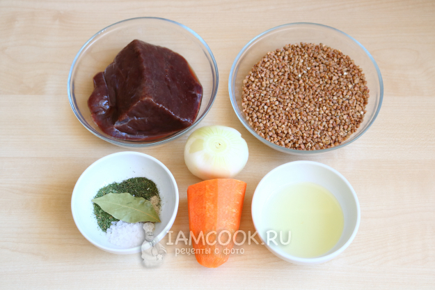 Для приготовления гречки с говяжьей печенью на сковороде на 3 персоны возьмите следующие компоненты. Количество овощей (лука и моркови) можно увеличить для получения более сочного блюда. Специи можно взять любые другие по своему вкусу.