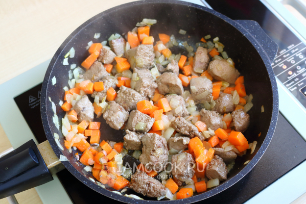 Выложите к овощам на сковороду и готовьте 5 минут, изредка перемешивая, чтобы печень схватилась со всех сторон.