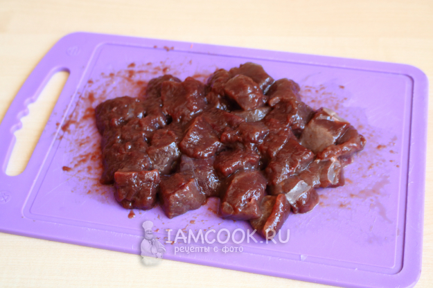 Печень промойте, очистите от плёнок и протоков (если присутствуют) и нарежьте некрупными кусочками.