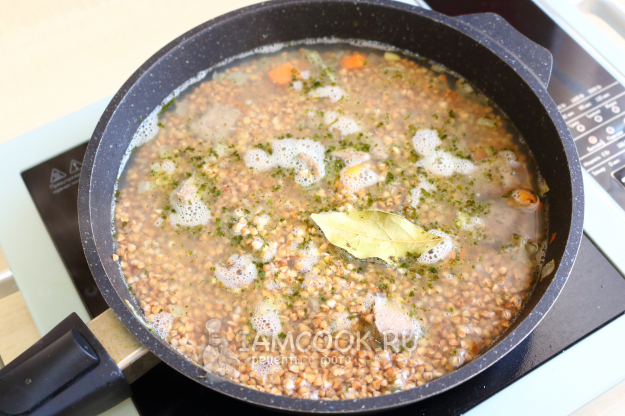Добавьте в сковороду промытую гречку, влейте горячую воду, положите лавровый лист.