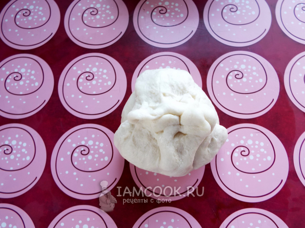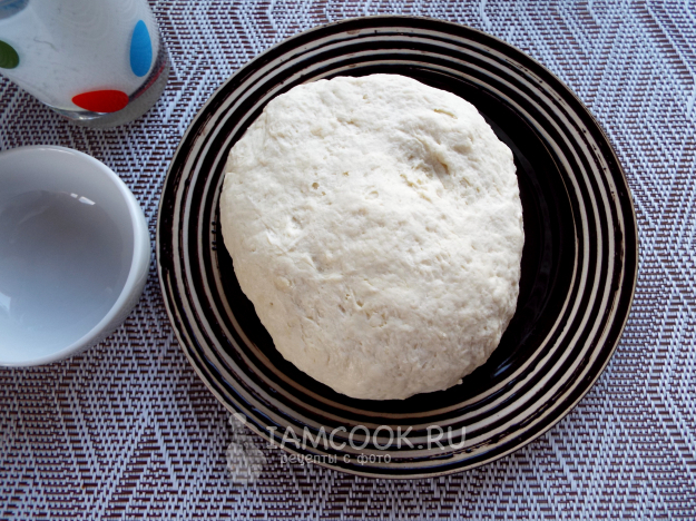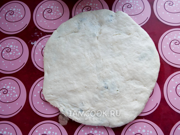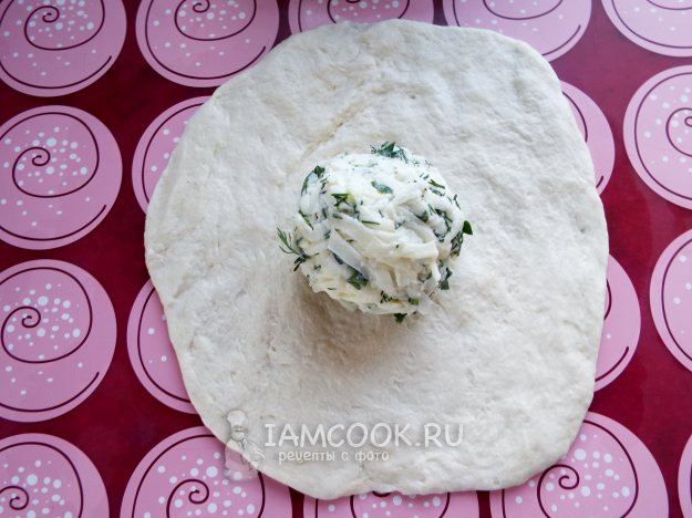 Тесто разделить на четыре колобка. Колобок размять в лепешку, в центр выложить колобок из сыра с зеленью.