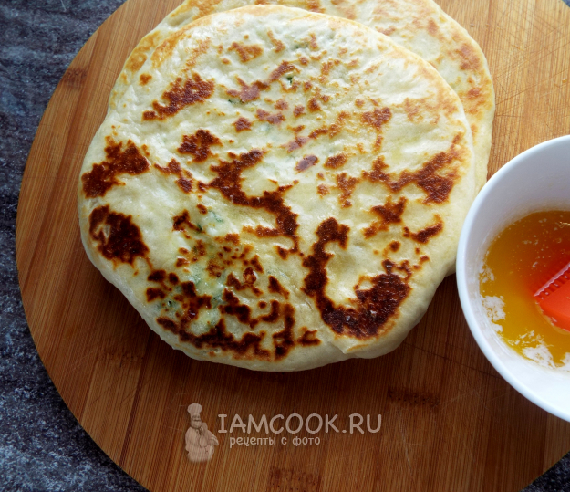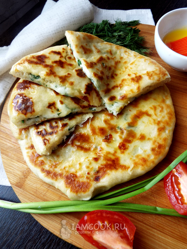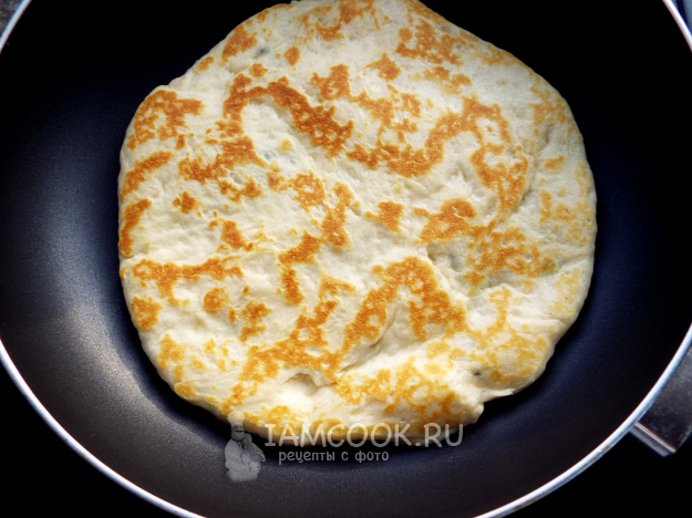 Жарить хачапури с сыром и зеленью до румяного цвета на сухой сковороде, с двух сторон.
