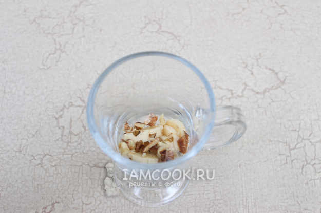 В чашу для подачи выкладываем дольки банана, небольшую горсть измельченных орехов и ириски.
