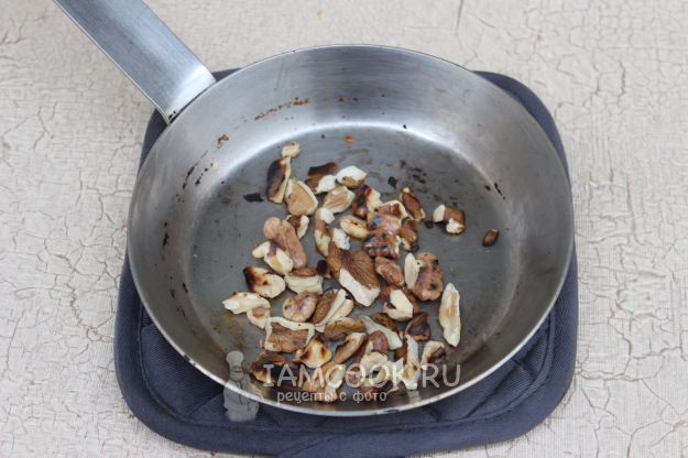 Обжарим орехи на сухой сковороде, так орешки станут более хрустящими и ароматными.