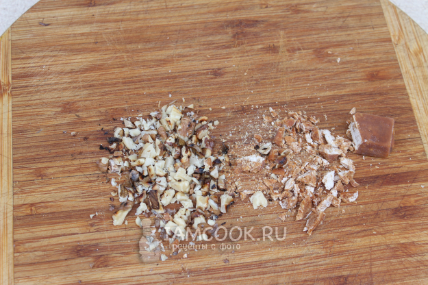 Рубим орехи и ириску. Ириску можно заменить шоколадом.