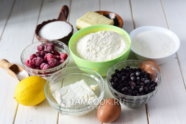Подготовим необходимые ингредиенты для заливного пирога с творогом и ягодами. Для работы нам потребуется мягкое сливочное масло, поэтому заранее выложим его на кухонный стол. Ягоды у меня замороженные - размораживать заранее их не нужно.