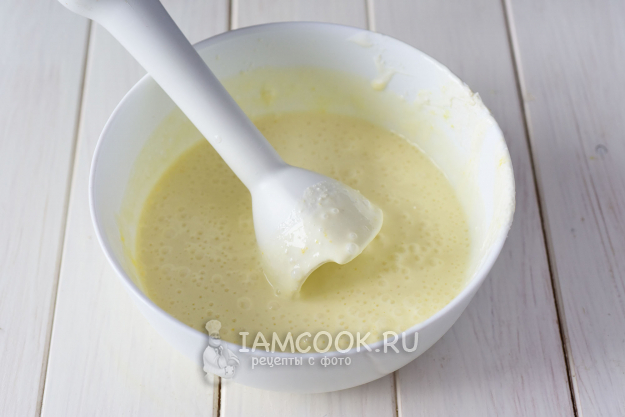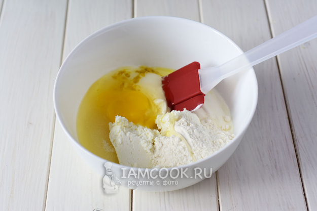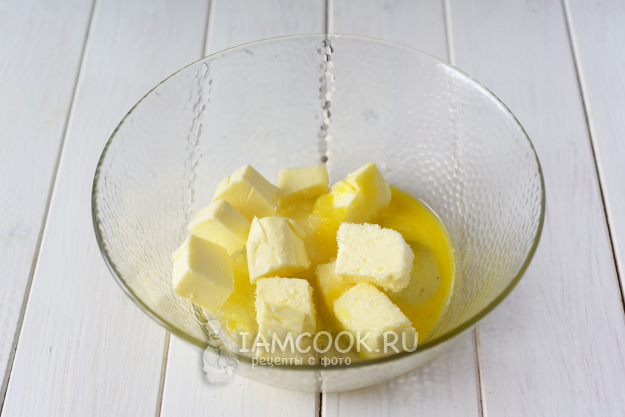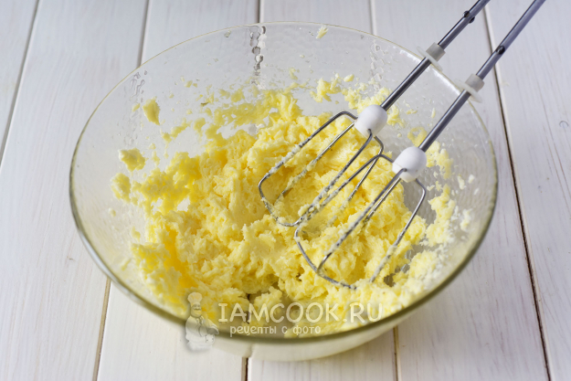 Приготовим тесто. В миску вобьем яйцо, засыплем сахар, добавим мягкое масло, нарезанное кусочками.