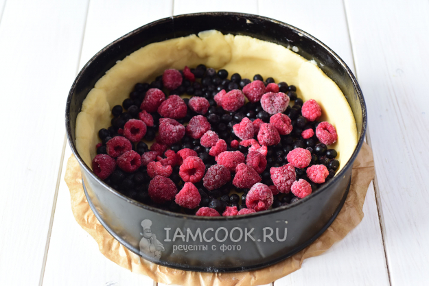 На дно формы с тестом выложим замороженные ягоды черники и малины.