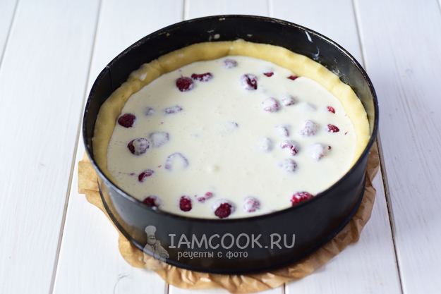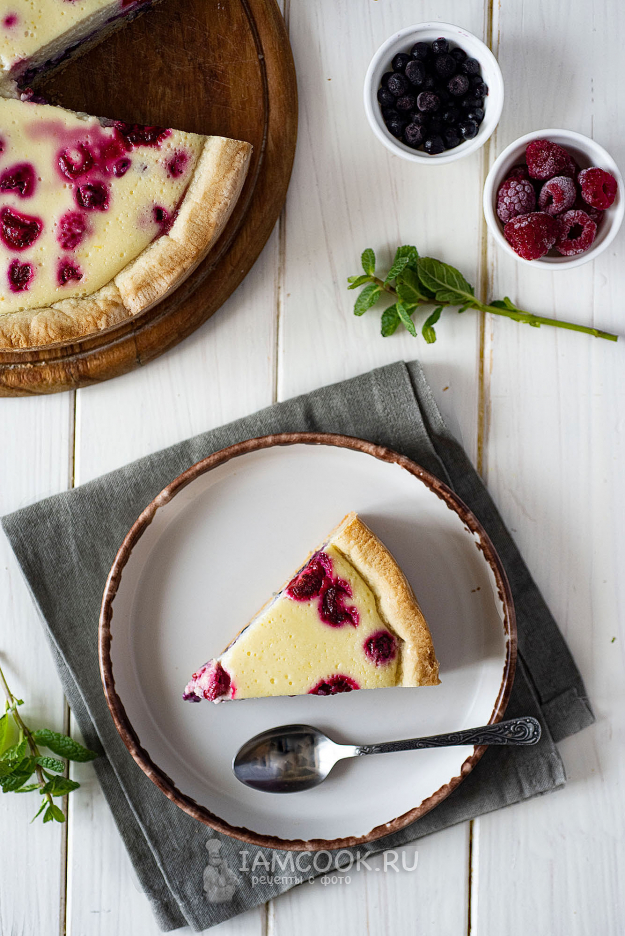 Поставим заполненную форму в заранее разогретую до 180 градусов духовку примерно на 40 минут. Показателем готовности заливного пирога с творогом и ягодами будут подрумяненные бортики и верх начинки, застывший наподобие творожной запеканки.