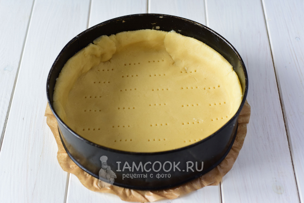 Раскатаем тесто в пласт и на скалке перенесем на дно формы, укладывая так, чтобы еще получились и бортики высотой в 4-5 см. Дно формы желательно заранее выложить пергаментом для выпекания. Тесто наколем вилкой. Заполненную форму временно отставим в сторону.
