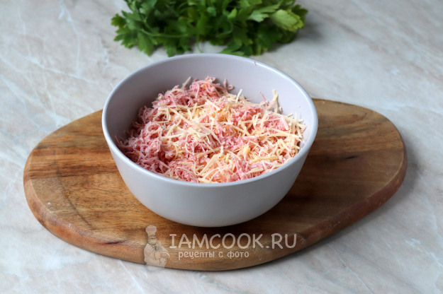 Вареную колбасу и твёрдый сыр натрите на терке со средними ячейками, соедините и перемешайте. Колбасу можно также нарезать мелкими кубиками, но я предпочитаю первый вариант.