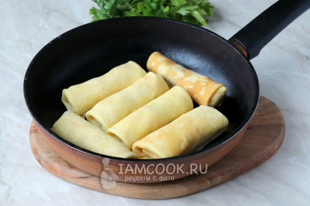 Затем на край блина выложите по 1 столовой ложке начинки и заверните рулетиком.
