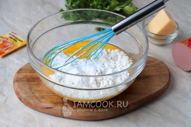 Затем в жидкую основу введите просеянную пшеничную муку и разрыхлитель.