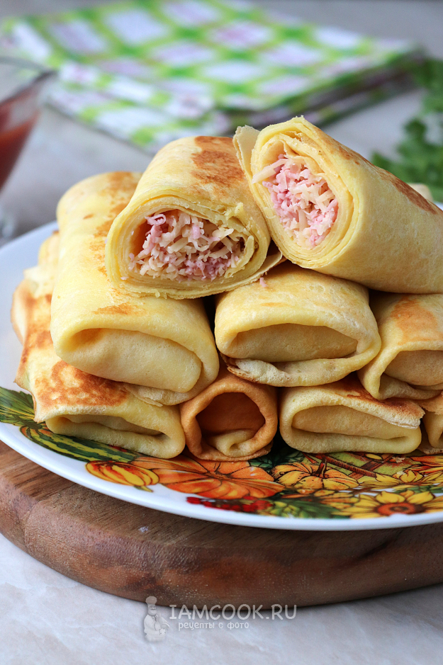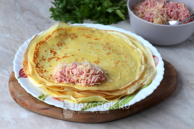 Вот такая красивая горка из блинов с вареной колбасой и сыром в начинке у нас получилась.