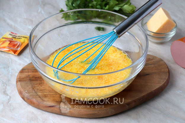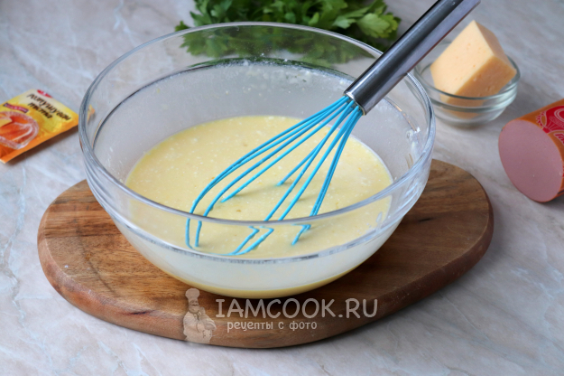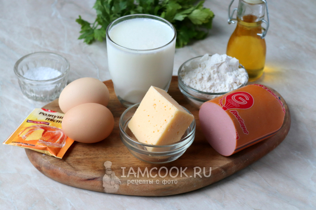Подготовьте все необходимые ингредиенты для приготовления тонких блинов с вареной колбасой и сыром в начинке.