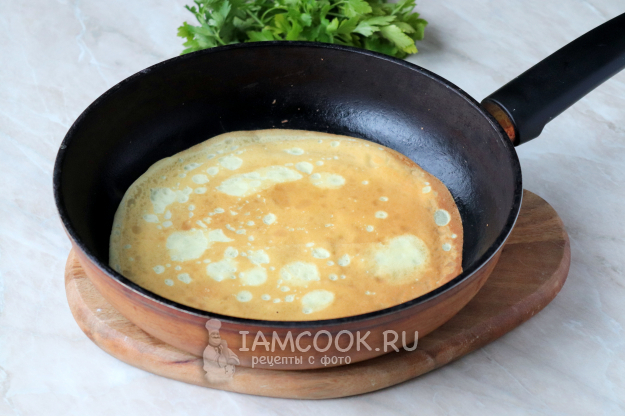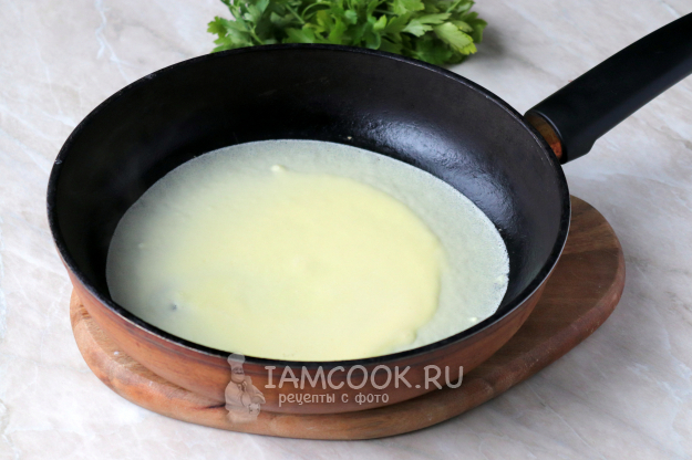 Прогрейте сковороду и перед жаркой первого блина смажьте её тонким слоем растительного масла. Затем влейте половину стандартного половника "отдохнувшего" теста и распределите его по всему дну, сформировав круглую заготовку.