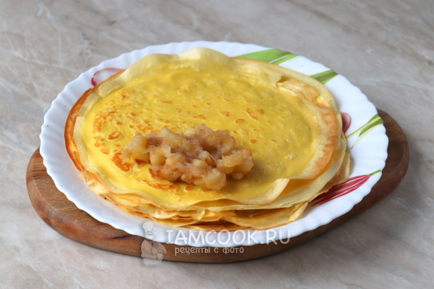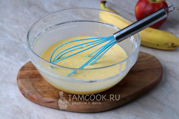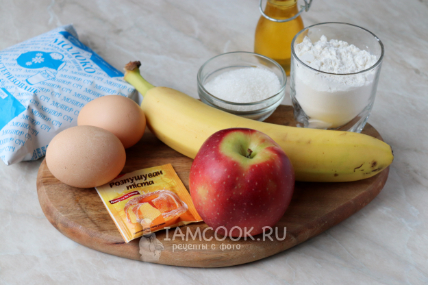 Подготовьте необходимые ингредиенты для блинов с начинкой из бананов и яблок.