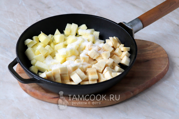 Для начинки очищенное яблоко и банан нарежьте средними кубиками и выложите на сковороду. Добавьте сахарный песок, немного молотой корицы и воды. Отправьте на огонь и, периодически помешивая, готовьте 10 минут на умеренном огне.