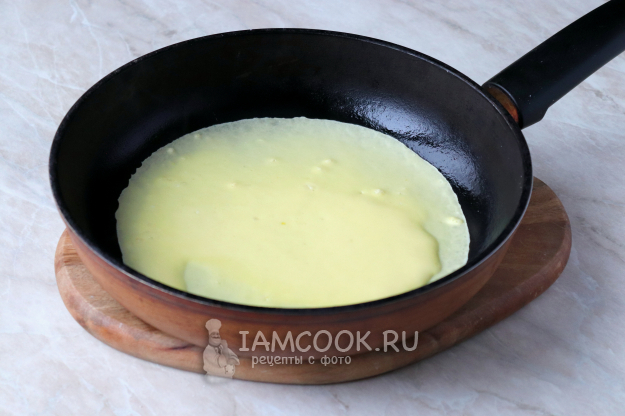 Сковороду смажьте тонким слоем растительного масла и хорошо прогрейте, затем влейте порцию блинного теста и распределите его по всему дну.