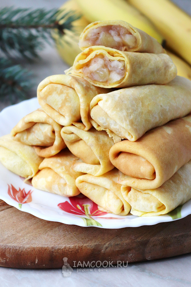 Вот и всё, вкусные и очень ароматные блины с начинкой из бананов и яблок готовы. Подавайте на стол в тёплом виде с чаем или молоком.