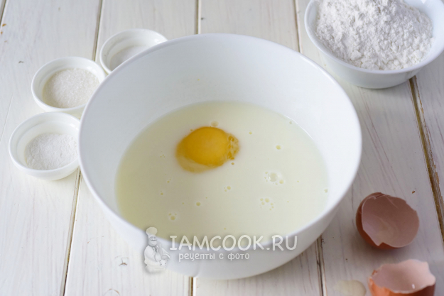 В миску зальем молоко, вобьем яйцо, добавим сахар и соль.