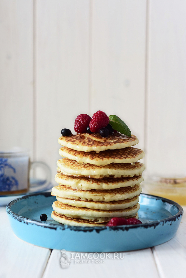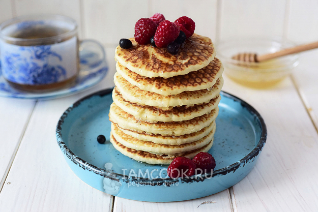 Так поступим со всем тестом, а готовые блинчики сложим стопкой на тарелку. На стол панкейки на рисовой муке и молоке подаем горячими с медом или любимым сиропом.