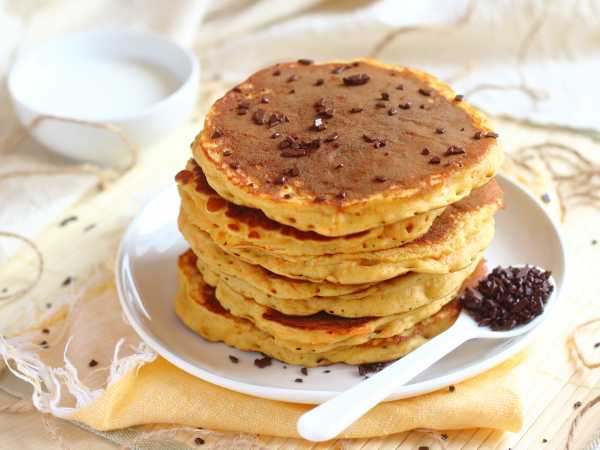 С помощью столовой ложки нальем тесто на сухую разогретую сковороду (2 ст.л. на одну порцию вполне достаточно), сформируем круглую лепёшку и сделаем умеренный нагрев. Как только увидим на поверхности пузырьки, перевернём панкейк на другую сторону и подождём, пока она также приобретёт золотистый цвет.