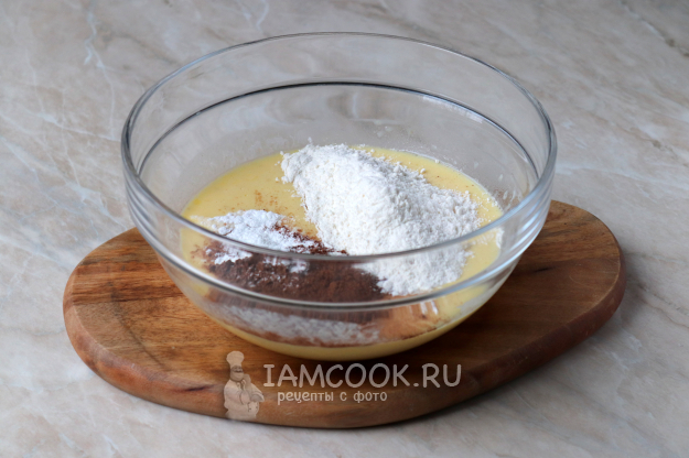 В жидкую основу введите просеянную пшеничную муку, разрыхлитель и какао-порошок.