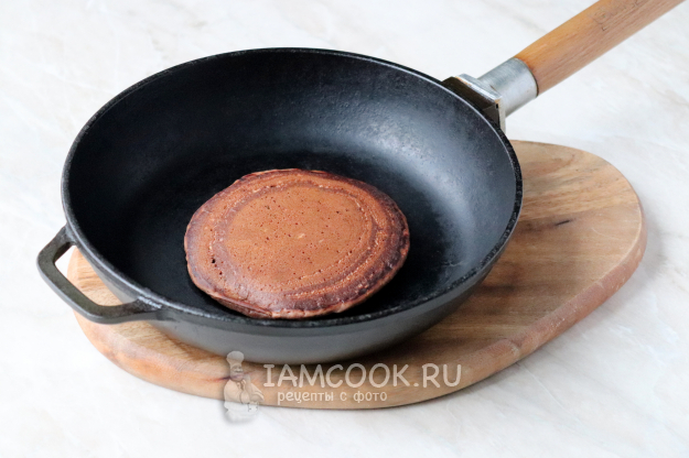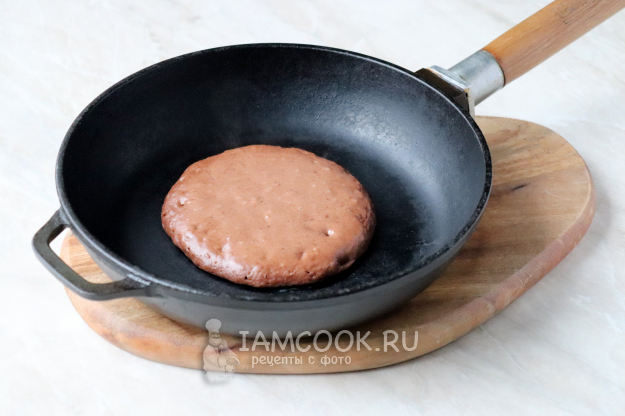 На разогретую сухую сковороду выложите пару столовых ложек теста, сформировав круглую заготовку.