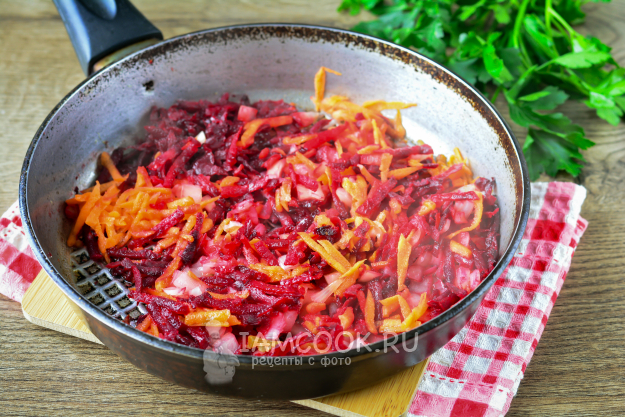 Разогрейте масло на сковороде, всыпьте лук, морковку и свеклу, пассеруйте пару минут до мягкости.