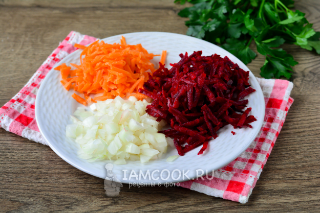 Тем временем почистите лук, морковку и свеклу. Лук накрошите кубиками, а свеклу и морковку натрите на терке.