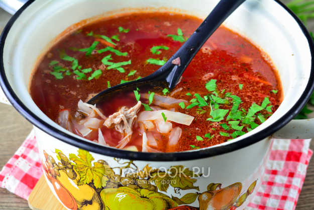 Попробуйте на вкус, добавьте любую нарезанную свежую зелень и выключите огонь. Прикройте крышкой и дайте настояться борщу с индейкой 15-20 минут.