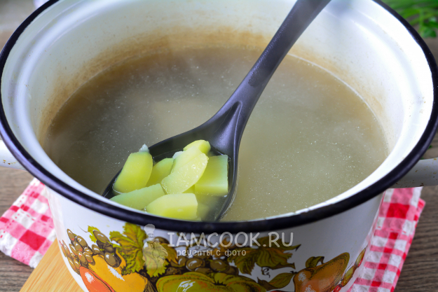 Всыпьте картофель в бульон, пусть закипит.