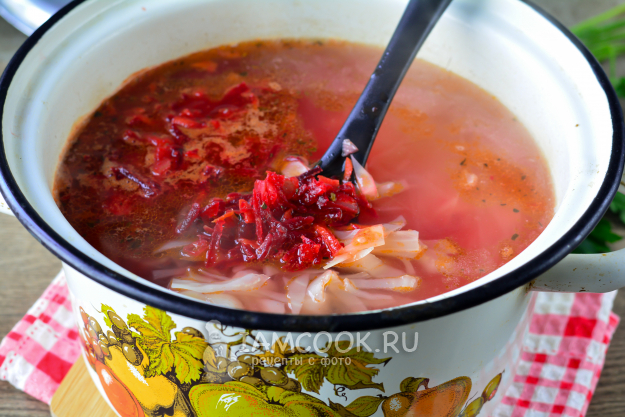 Когда картофель и капуста будут готовы, всыпьте в борщ овощную зажарку, добавьте специи по вкусу. Можете добавить черный молотый перец. Я еще добавила щепотку сушеного базилика для аромата. Варите борщ из индейки 4-5 минут, чтобы цвет стал насыщенным, ярким.