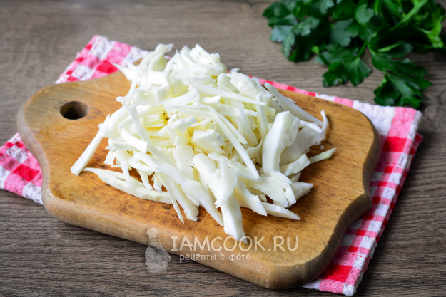 Белокочанную капусту нашинкуйте полосками при помощи ножа или специальной терки.