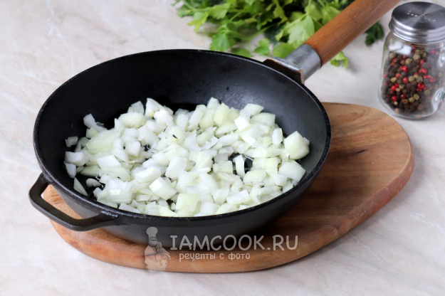 Очищенный лук нарежьте небольшими кубиками и обжарьте на растительном масле до золотистого цвета, периодически помешивая, чтобы не подгорел.