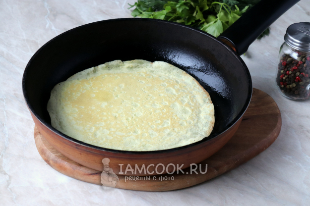 Жарьте блин на среднем огне по 1-1,5 минуты с каждой стороны, до золотистого цвета. Затем переложите его на плоскую тарелку, а на сковороду налейте новую порцию теста, и так до тех пор, пока оно полностью не закончится. Готовые блины должны немного полежать и отмякнуть, а пока можно заняться начинкой.