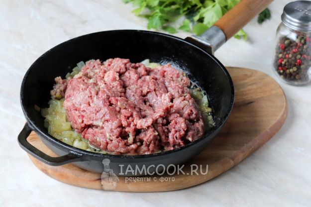 Затем к обжаренному луку добавьте мясной фарш, посолите, поперчите и интенсивно перемешайте, чтобы не образовались крупные кусочки.