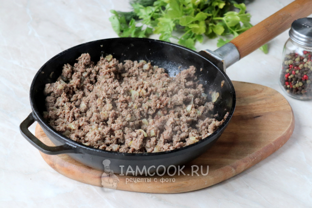 Жарьте всё вместе около 15 минут, до полной готовности, не забывая помешивать. Сначала фарш пустит много сока, а когда он выпарится - начнёт поджариваться. В начинку, кроме соли и перца, можно добавить любые ароматные травы, которые вам нравятся по вкусу и аромату.