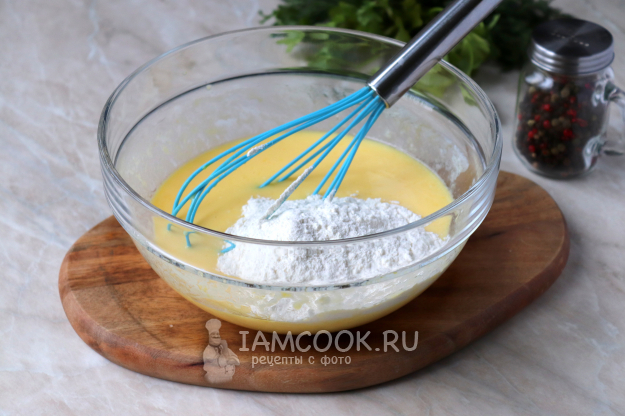 Затем введите просеянную пшеничную муку, смешанную с разрыхлителем.