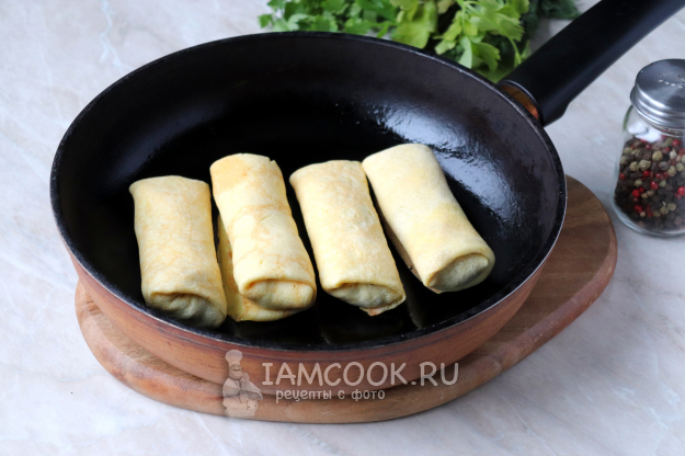 Выложите по 1 столовой ложке обжаренного фарша на край блинчика и заверните в рулетик.