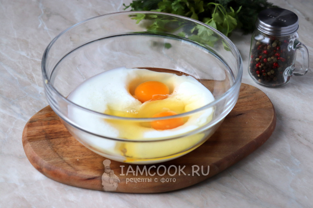 В глубокую миску налейте тёплый кефир (у меня - 1%), добавьте соль, сахар, куриные яйца и пару столовых ложек растительного масла, желательно рафинированного, без запаха.