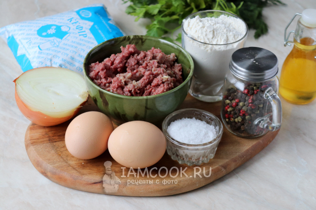 Возьмите необходимые ингредиенты для приготовления румяных блинов на кефире с фаршем.
