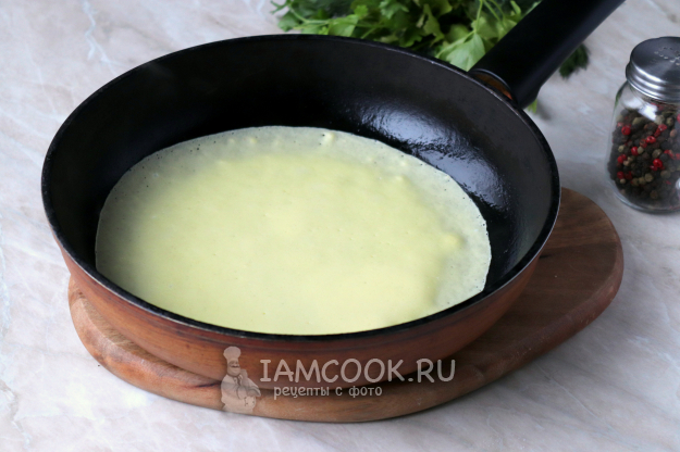 Накройте миску полотенцем и оставьте тесто в покое на 10-15 минут, после чего приступайте к выпечке блинов. Смажьте сковороду тонким слоем растительного масла и вылейте порцию "отдохнувшего" теста. Распределите его по всему дну, сформировав круглую заготовку.