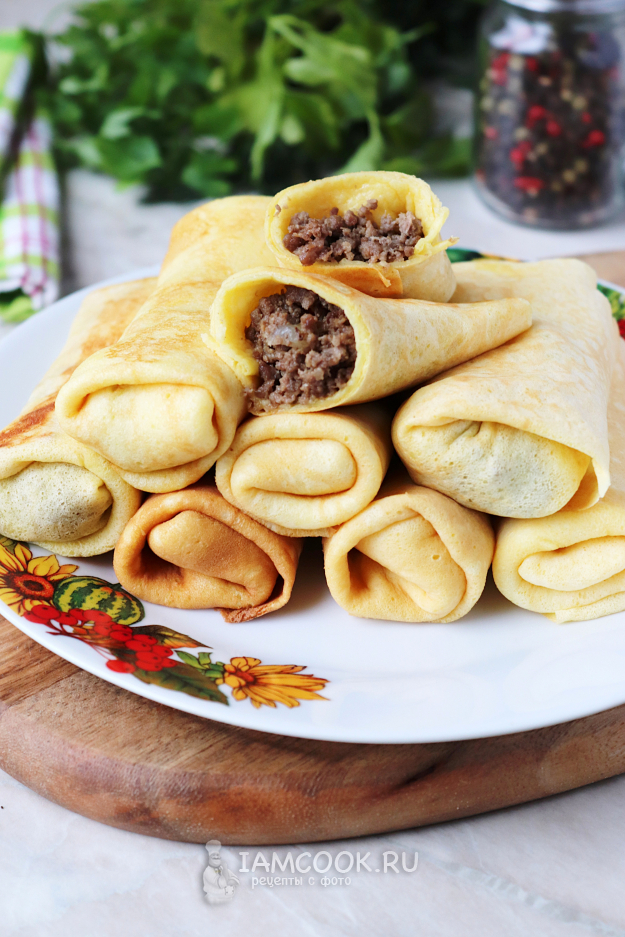 Вот и всё, вкуснейшие блины с начинкой из мясного фарша готовы. Подавайте их на стол в тёплом виде, очень вкусно со сметаной.