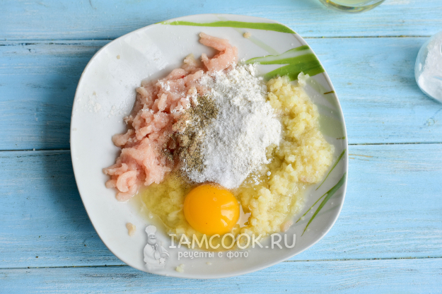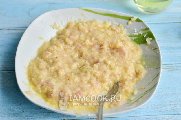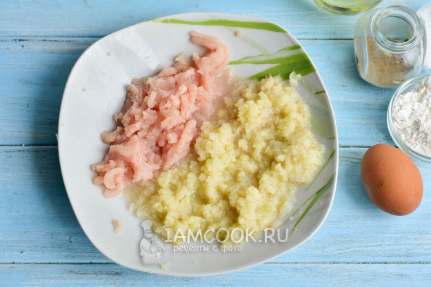 В мясорубке перекрутите цветную капусту и куриное филе.