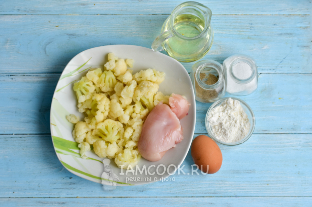 Подготовьте ингредиенты для оладий из куриного фарша и цветной капусты.