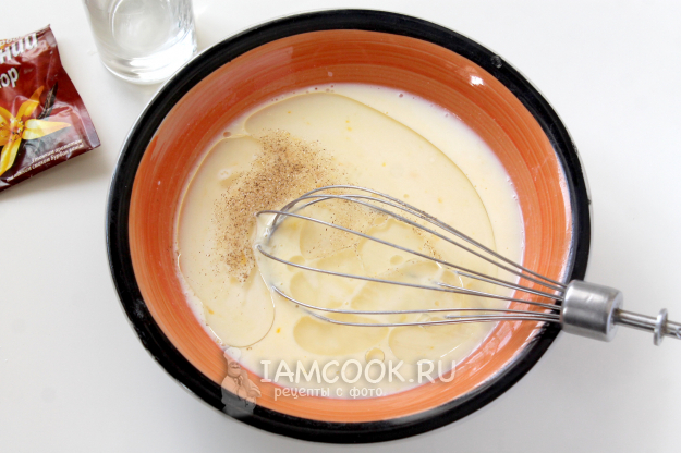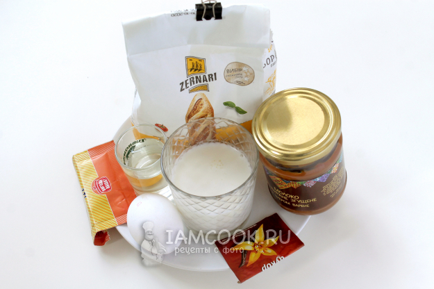 Возьмите продукты для приготовления панкейков со сгущенкой внутри. Если тесто любите послаще, прибавьте при замесе теста сахарный песок.