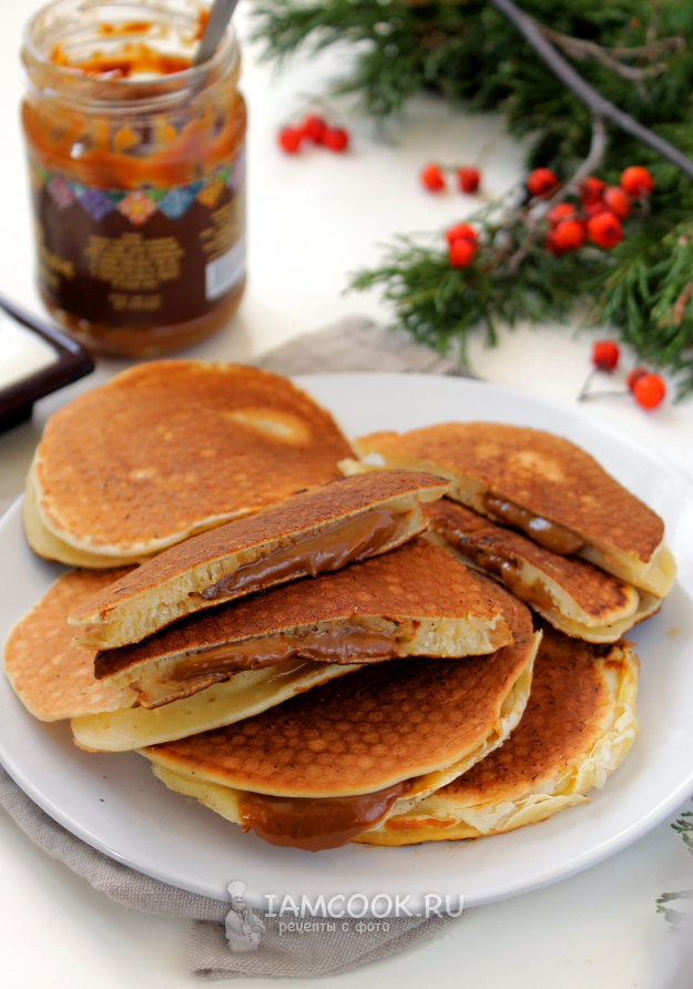 Подавайте панкейки с начинкой из сгущенки внутри сразу же, теплыми и мягкими.