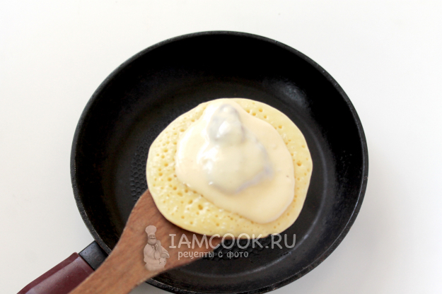 Аккуратно отделите панкейк от сковороды, на начинку влейте немного теста - спрячьте сгущенку. Уверенным движением переверните блин и допекайте до румянца с обратной стороны.
